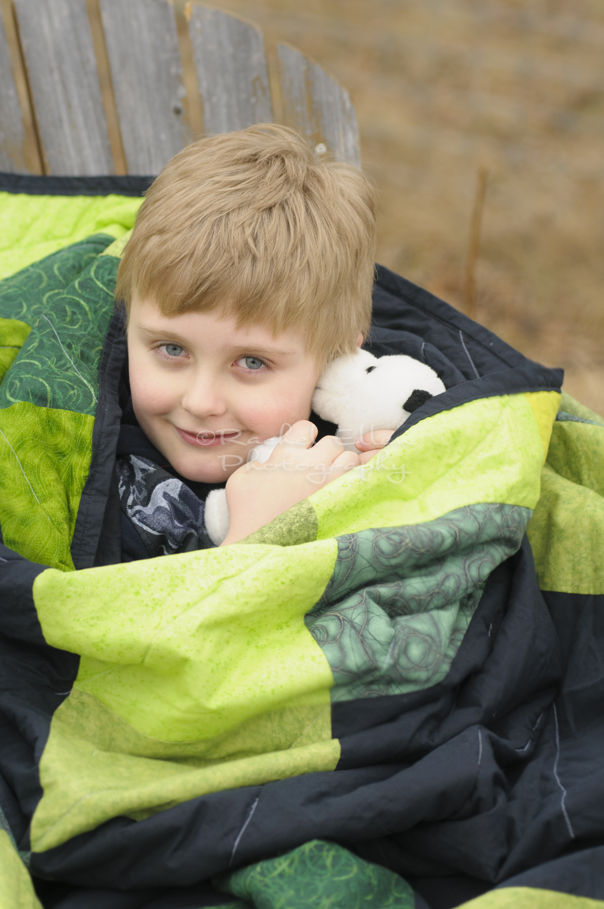 We then went back to the house where my husband had built an outdoor fire for everyone to warm up, and have a break. After a hot chocolate and a little snack, we captured some portraits of everyone cuddling by the fire. We included some of the beautiful quilts made by Thor’s Grandma in the portraits, as a relevant prop to their family. I love the portrait of Thor cuddling with his quilt, and favourite stuffed animal.