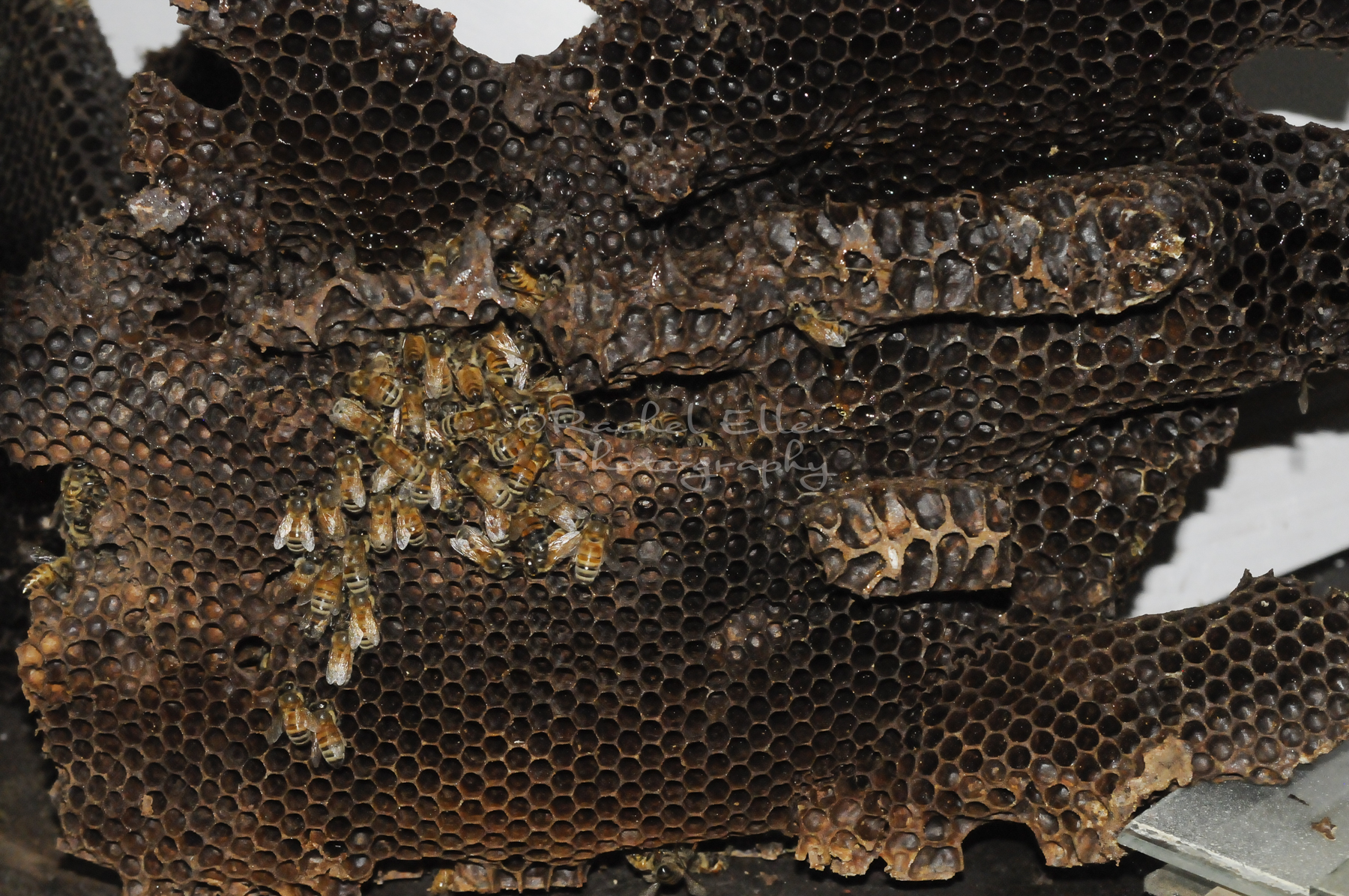 It became apparent that this location had been inhabited by a large colony of bees before. There was abundant old brood comb from several years before, but not much honey to speak of, indicating that this was a new swarm that had moved in.